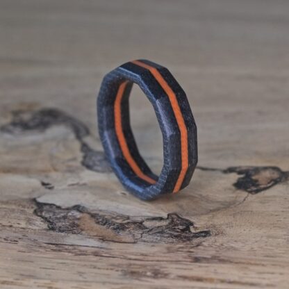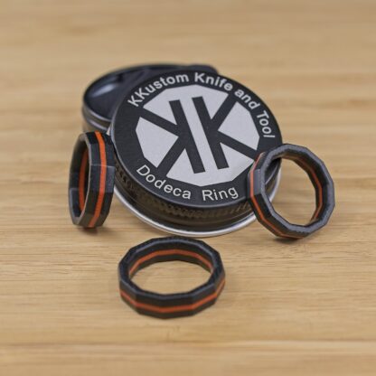 This is a small run of Dodeca’s that I made using USA-Sourced Black Canvas Micarta with an Orange G10 stringer.  I first CNC-machine these using a special workholding process, and then I hand finish each ring individually.  The rings are given a coat of Tru-Oil and then once dry, they are given a final hand-rub of beeswax.