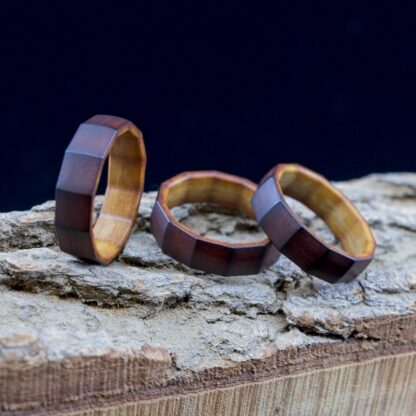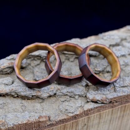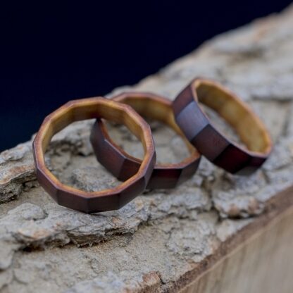 This is a small run of Dodeca’s that I made using ‘Maple Valley’ Richlite. This phenolic/paper thermoset material is very strong, yet still has an organic feel to it. I first CNC-machine these using a special workholding process, and then I hand finish each ring individually. The rings are given a coat of Tru-Oil and then once dry, they are given a final hand-rub of beeswax. These particular pieces also have been flame-toasted to give them a darker outer skin that transitions into the lighter maple color.
